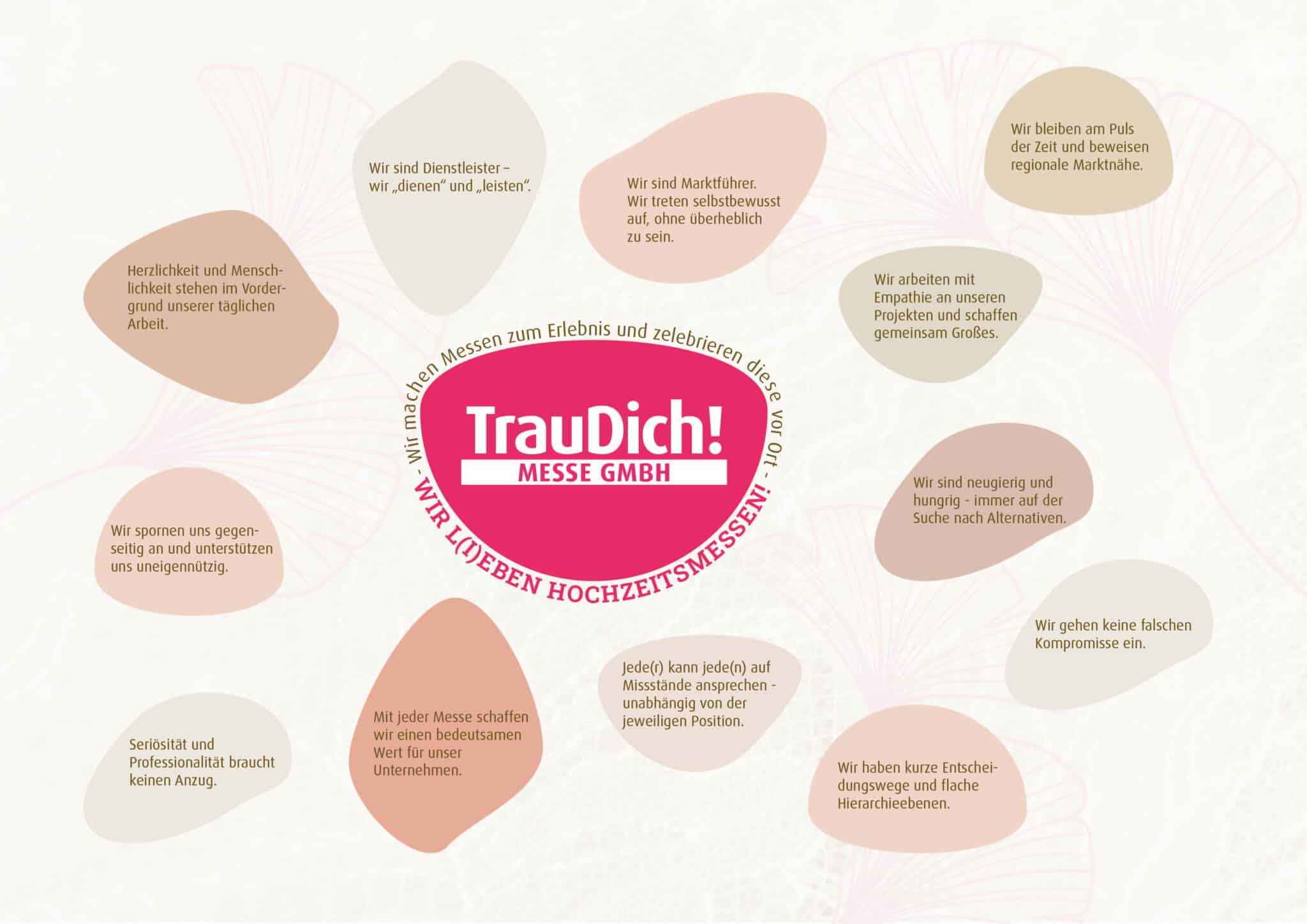 Seit 1994 sehen wir es als unsere Mission und Leidenschaft, Brautpaaren und Anbietern aus den jeweiligen Metropolregionen eine möglichst inhaltsstarke und erlebnisreiche Plattform „für den schönsten Tag im Leben“ zu erschaffen. So steht die TrauDich! für eine unvergleichbar große Vielfalt an Produkten und Dienstleistungen rund ums Heiraten und Feiern.
